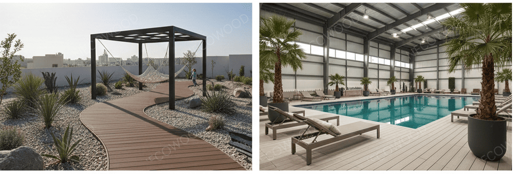 NECOWOOD produkuje produkty o wysokiej wydajnościDeski tarasowe z kompozytu drewna i tworzywa sztucznegospecjalnie dla Bliskiego Wschodu. Nasze płyty zawierają zaawansowane stabilizatory światła, które zapewniają trwałość kolorów w środowiskach o wysokim poziomie promieniowania UV.